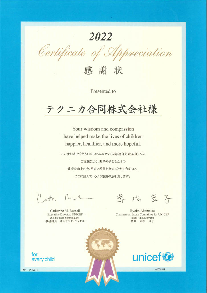 (財)日本ユニセフ協会から2022年の感謝状を授与されました。