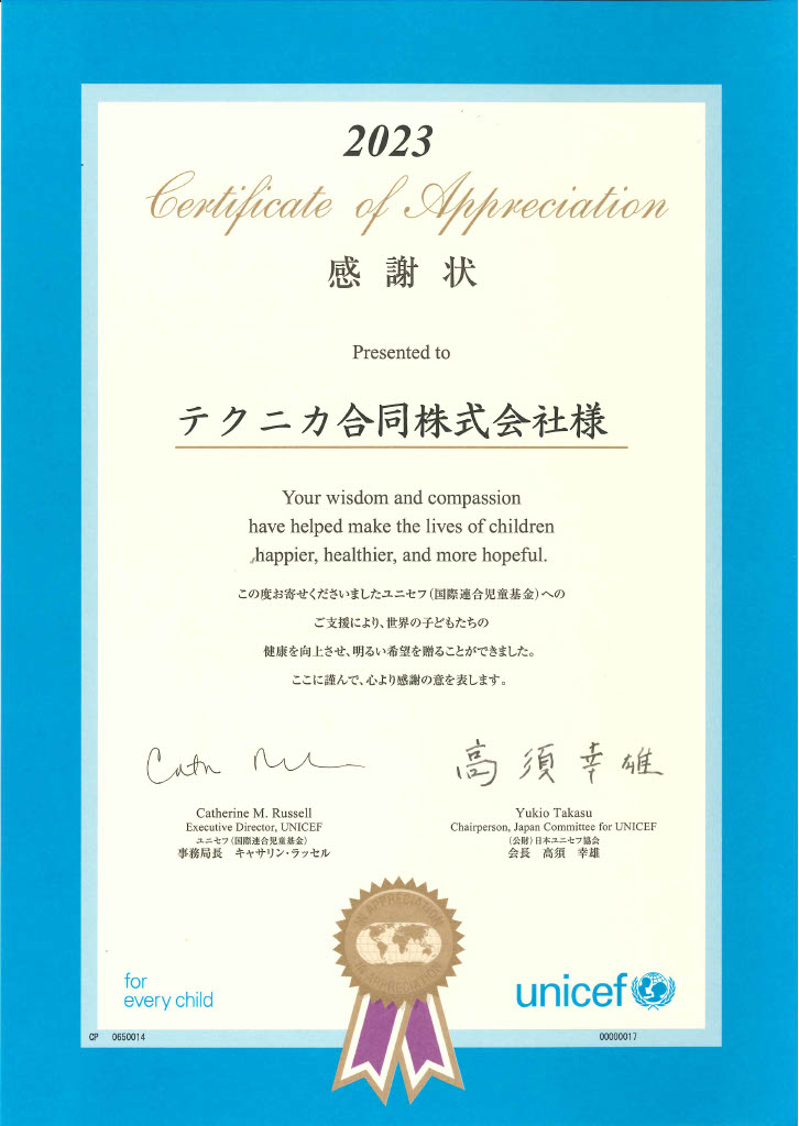 (財)日本ユニセフ協会から2023年の感謝状を授与されました。