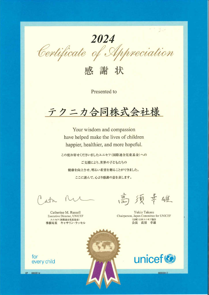 ユニセフから2024年の感謝状を授与されました