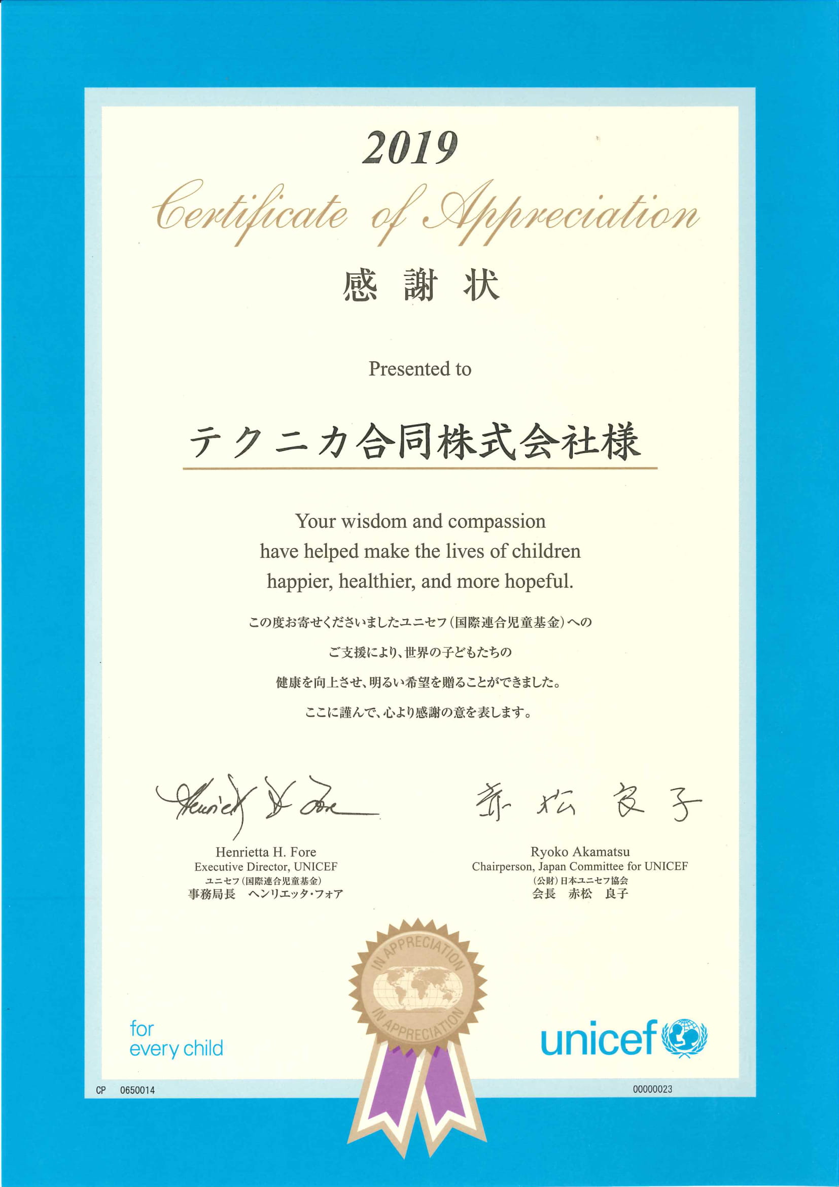(財)日本ユニセフ協会から2019年の感謝状を授与されました。